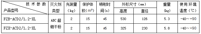 FZX-ACD2/1.2-XL、FZB-ACD2/1.2-XL悬挂式干粉灭火装置专为客车、公交车和小汽车不同的发动机舱、电池舱和高压舱等高温线路易着火部位而设计,固定安装于防护区外面,提高了灭火效果并便于维护操作, 等不利因素,而且具有抗震能力和适用于恶劣环境。本装置由灭火剂、压力容器、控制电路板、控制线路、喷粉管、火警按钮盒组成。该项技术获得国家发明专利。