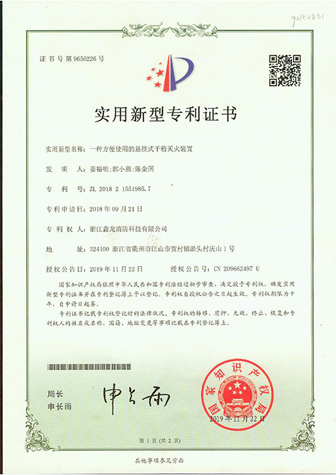 实用新型专利证书-一种方便使用的悬挂式干粉灭火装置